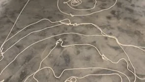 This is a large-scale weaving and collaborative performance which concurrently balances acts of creation with acts of destruction through acts of repair. A constant cycle of making and un-making. The large-scale woven installation simultaneously represents a mycelial network and quantum notions of time. Together, the mycelial weavers build and make the piece into existence. At the opening, audience members were encouraged to pick up balls of rope and weave and create messages.