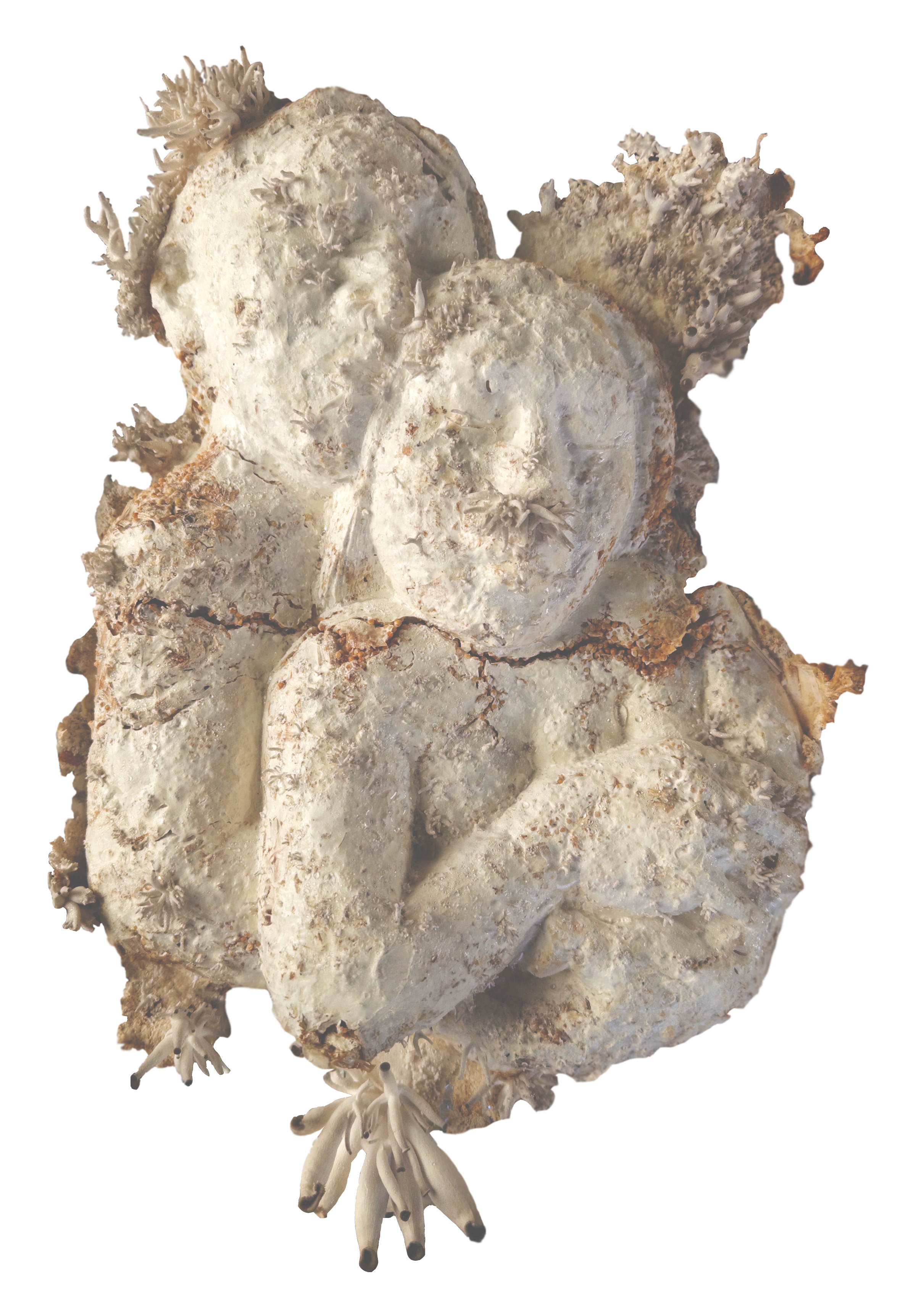 Oyster mushrooms grown into Roxanne’s sculptural casting molds. The substrate for the oyster spawn were Pueblo Red and Yellow Corn cobs and husks - spent agricultural waste from Flowering Tree Permaculture Institute. For more information, view the text document.